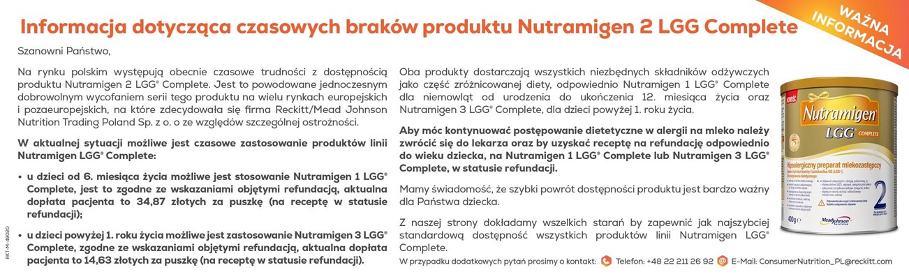 Nutramigen 1 LGG® Complete to hipoalergiczny preparat mlekozastępczy o wysokim stopniu hydrolizy na bazie kazeiny do stosowania w diecie u dzieci z alergią na białko mleka krowiego od urodzenia.